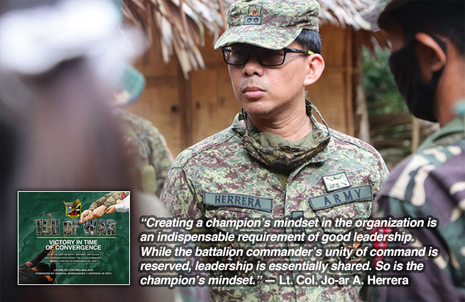 “Creating a champion’s mindset in the organization is an indispensable requirement of good leadership. While the battalion commander’s unity of command is reserved, leadership is essentially shared. So is the champion’s mindset.” — Lt. Col. Jo-ar A. Herrera
