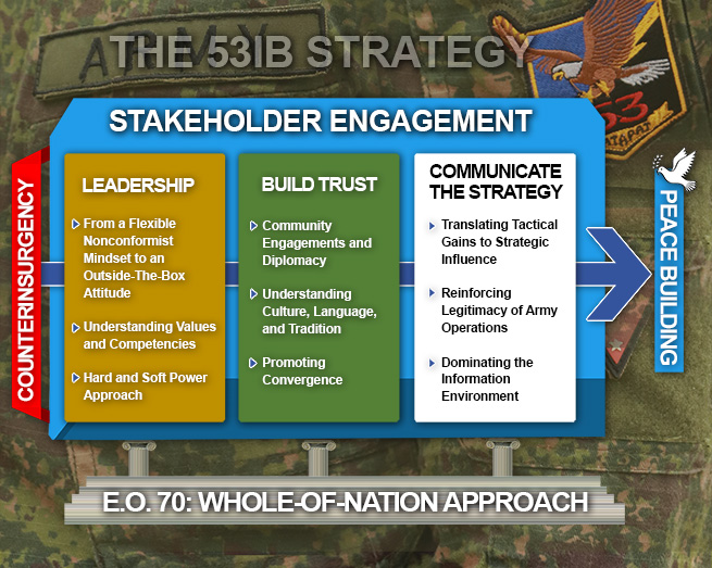 The 53IB strategy was held tightly by three pillars: transformational leadership, building trust, and communicating the strategy. The pillars stand firmly on the thrust of Executive Order 70, which provides for the Whole-of-Nation Approach, converging all government entities and the community in a holistic national anti-insurgency program.
