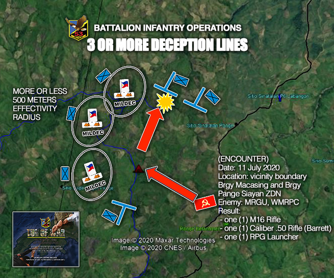 When an Intelligence Collection Team (COLT) reports a CNT sighting, the Battle Staff defines the area of operation. They establish a blockline, a deception line, and the vacuum area where troops pursue the enemy. These are imaginary lines that define where and what forces will be deployed. Along the blockline, blocking troops are mobilized. They stay hidden and invisible as they wait for the enemy to fall into their ambush traps. While blocking forces lay in wait, a team is deployed to set decoys such as tents and flag poles inside the deception area. “Deception was a new strategy introduced by the commander. At the start, we were only following orders until the strategy was giving us more hits that we realized its importance and usefulness,” Second Lieutenant Yu declared.