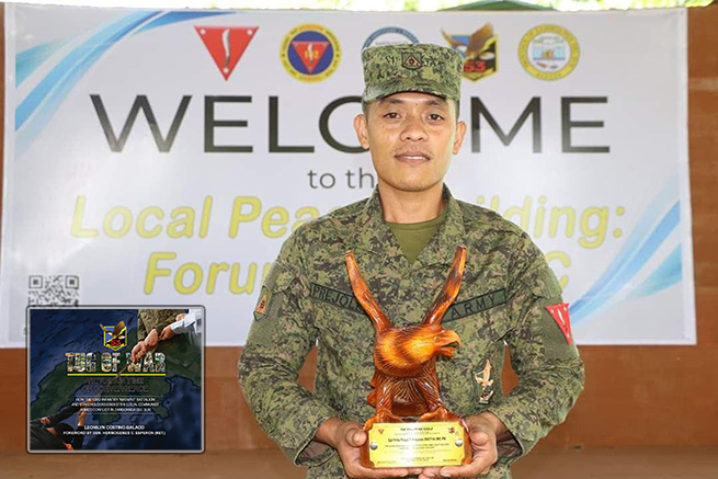CPL Fritz Floyd Prejoles was recognized as the Best Enlisted Personnel (CY 2020) during the 84th Anniversary celebration of the Philippine Army. He is also a recipient of Gold Cross Medal as Squad Leader of Intelligence Platoon, 53IB in the Battle of Marangan, Dumingag, ZDS.4